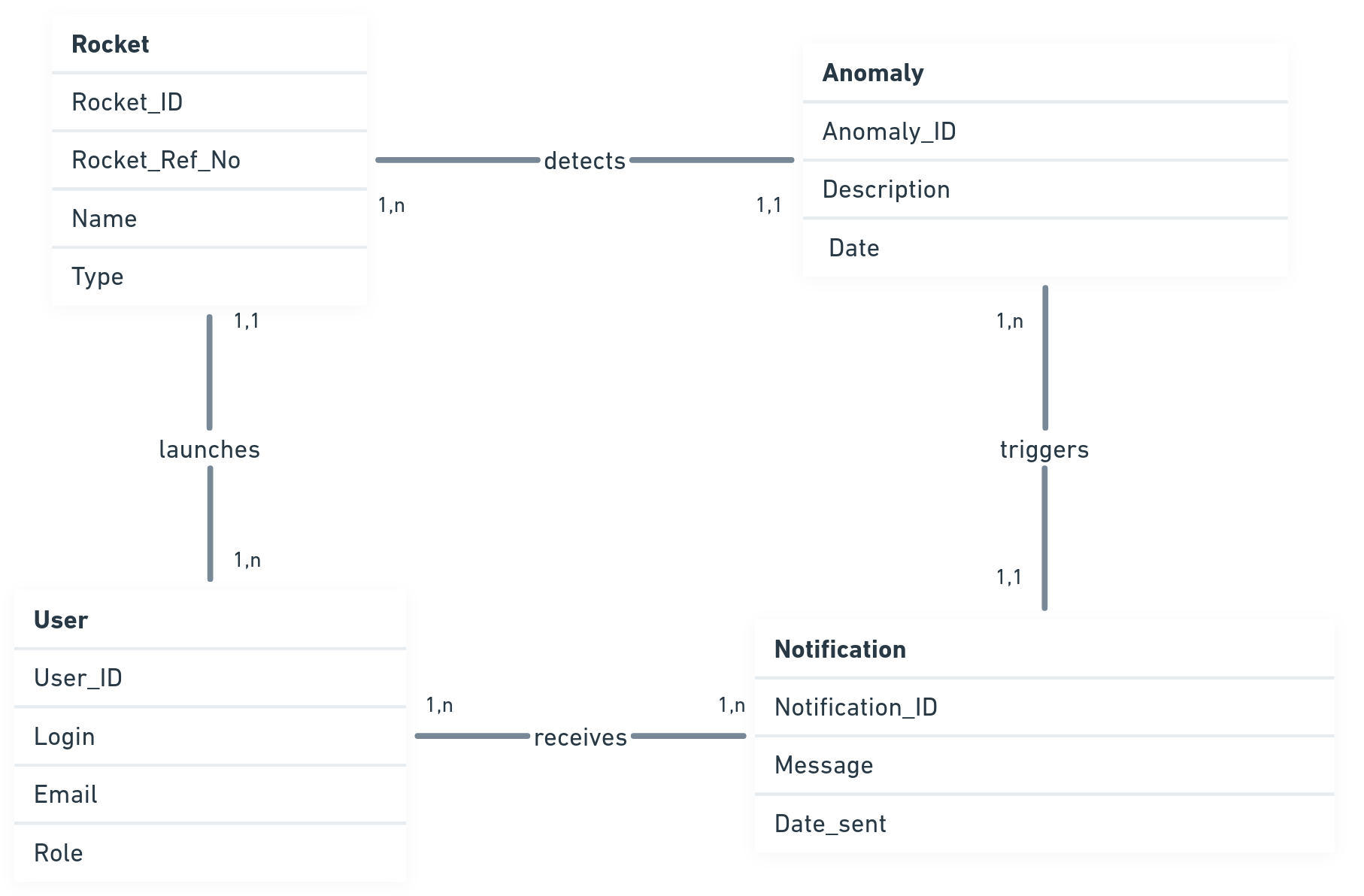 - Rocket and Anomaly: “Detects” relationship. One rocket can have multiple anomalies, but a single anomaly can be linked to just one rocket.